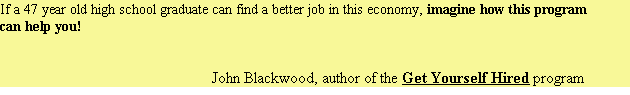 "From fired to hired in 3 weeks!" On January 7, 2010 I lost my job. Using this program I was back to work in just 3 weeks! Not only did I get another job, I found a position I really enjoy that better suites my needs and abilities. I also received several other job offers and was able to make the best career decision for my family and myself. Then it got even better!