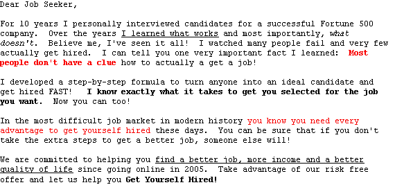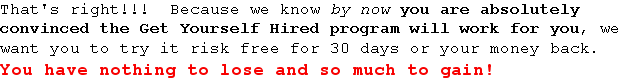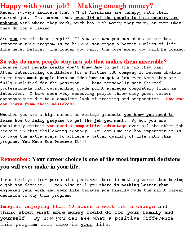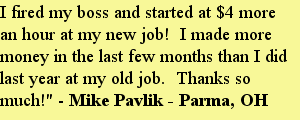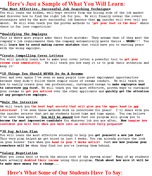 "From fired to hired in 3 weeks!" On January 7, 2010 I lost my job. Using this program I was back to work in just 3 weeks! Not only did I get another job, I found a position I really enjoy that better suites my needs and abilities. I also received several other job offers and was able to make the best career decision for my family and myself. Then it got even better!